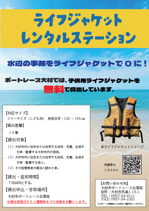 ボートレース大村では各学校及び団体がプールや海、川などで活動を実施する際に、参加する子供たちが安全に楽しく活動できるよう、ライフジャケットを無料で貸し出します。